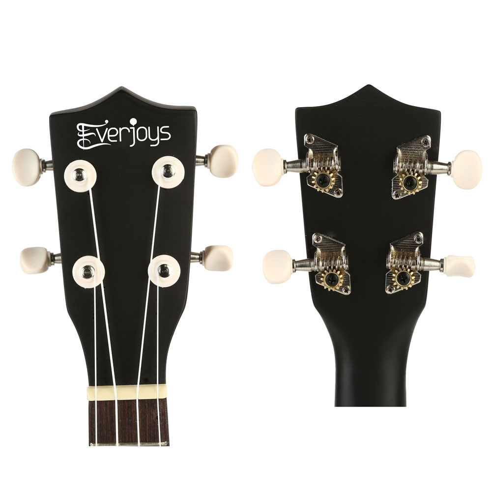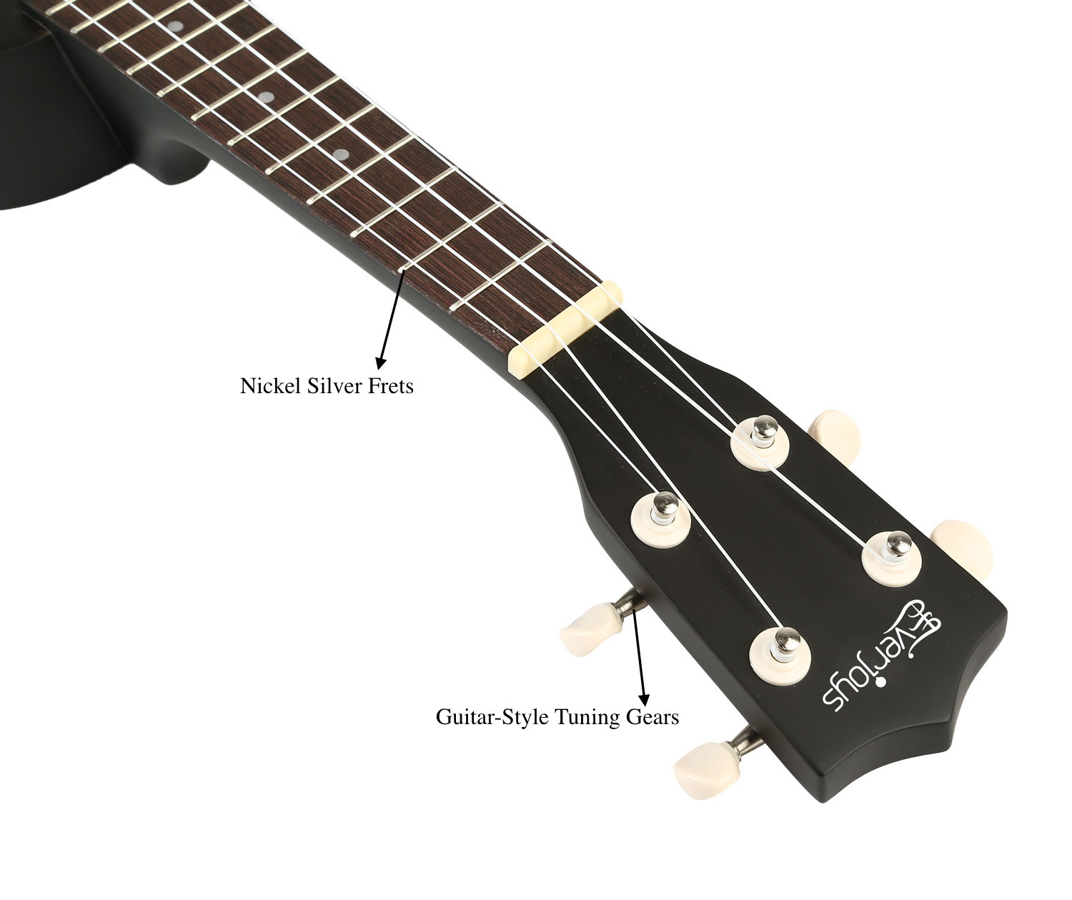 Leicht zu erlernen: Verbringen Sie mehr Zeit mit Spielen und weniger Zeit mit dem Stimmen! Genaue und glatte, verchromte Tuner im Gitarrenstil, damit Ihre Ukulele immer in Einklang bleibt. 12 Bünde aus Neusilber mit korrekten Bünden mit Markierungen am 5., 7., 10. Bund am Hals, oben auf dem Griffbrett